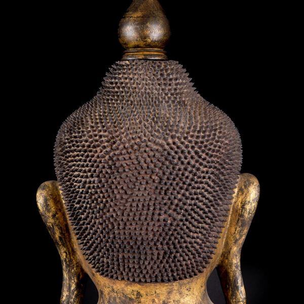 Di pregevole fattura, la testa del Buddha presenta un' accurata acconciatura e un' espressione di grande serenità.