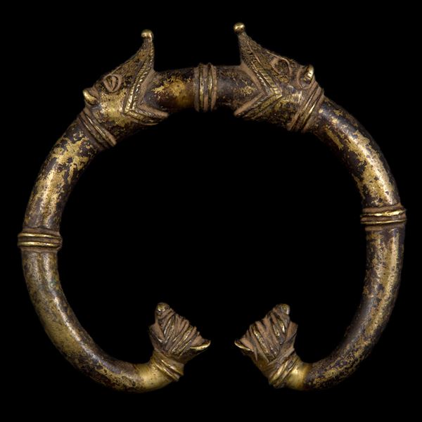 Una statua di Nandi (il toro sacro) in bronzo, Ganesh (il dio con la testa di elefante) in marmo e un manico in bronzo con le teste di due animali mitologici.