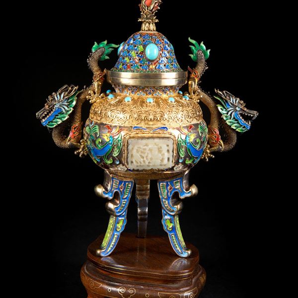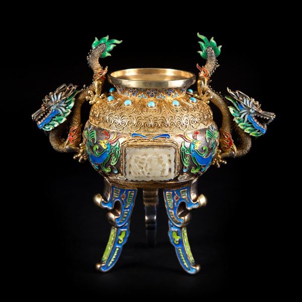 TRIPODE IN FILIGRANA D'ARGENTO E GIADA, Cina, XX secolo