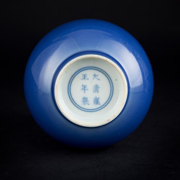 I lati rigonfi si innalzano in una sagoma verticale fino a una piccola bocca, è ricoperta di smalto blu; al centro della base reca il marchio a sei caratteri in blu sotto coperta dell'Imperatore Yongzheng all'interno di un doppio cerchio.