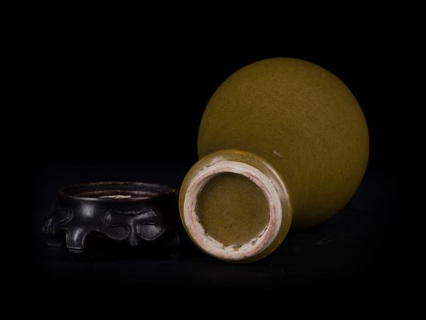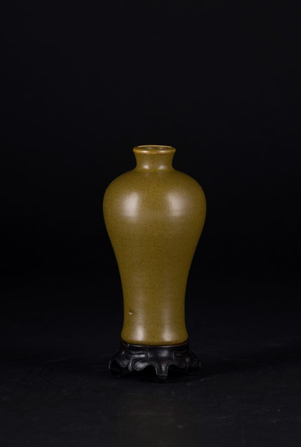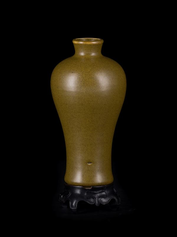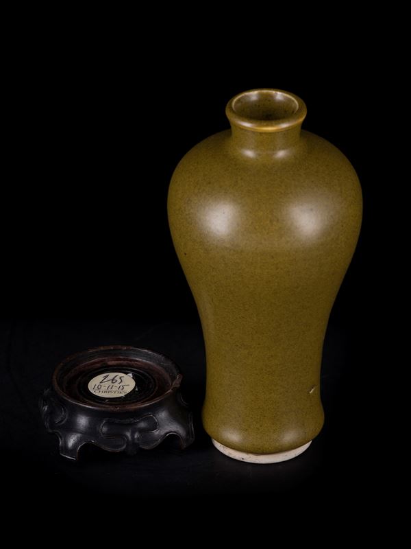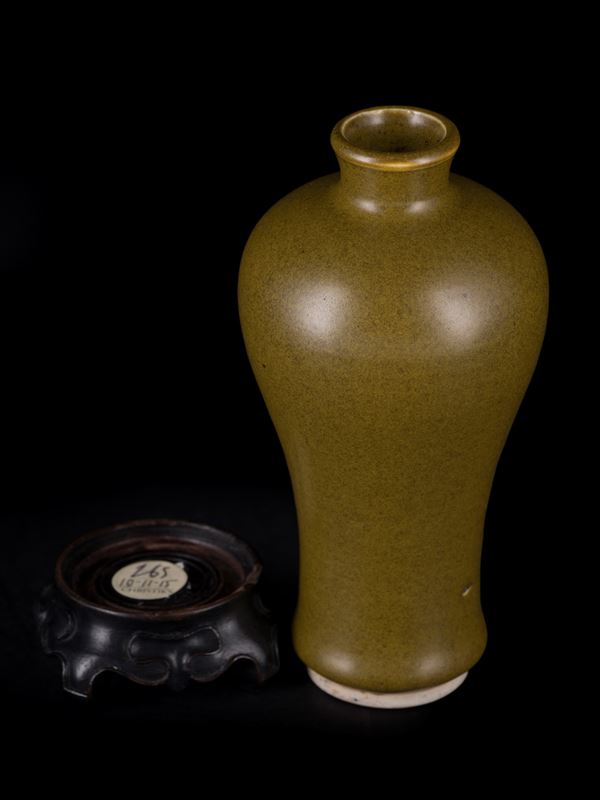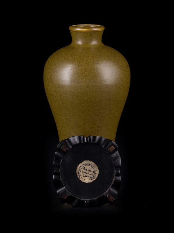 Dalla classica forma a 'Meiping' è completamente ricoperto da uno smalto color marroncino chiaro opaco, ad eccezione del piede rialzato ad anello. Poggia su una base in legno su cui sono presenti due etichette di cui una di Christie's.