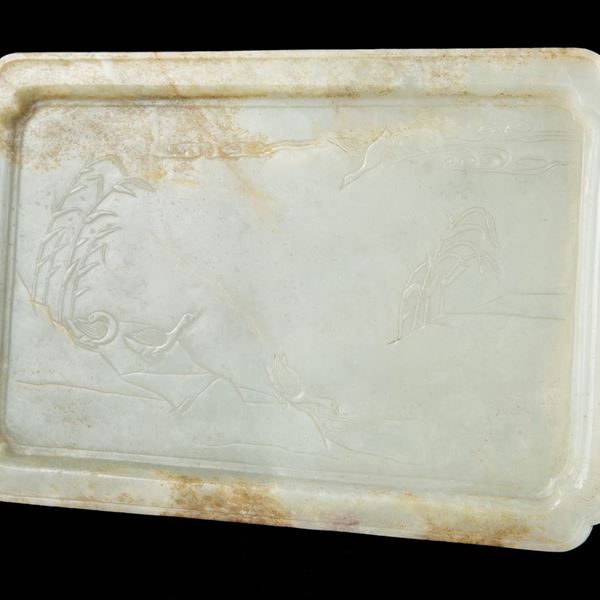 Il vassoio di forma rettangolare è finemente scolpito a basso rilievo e raffigura una scena lacustre con un gruppo di oche. Ai lati del lago un gruppo di canne, un'oca sembra bere dalla riva mentre un'altra vola per atterrare tra le nuvole che scorrono in alto. Accompagnato da un supporto in legno montato.