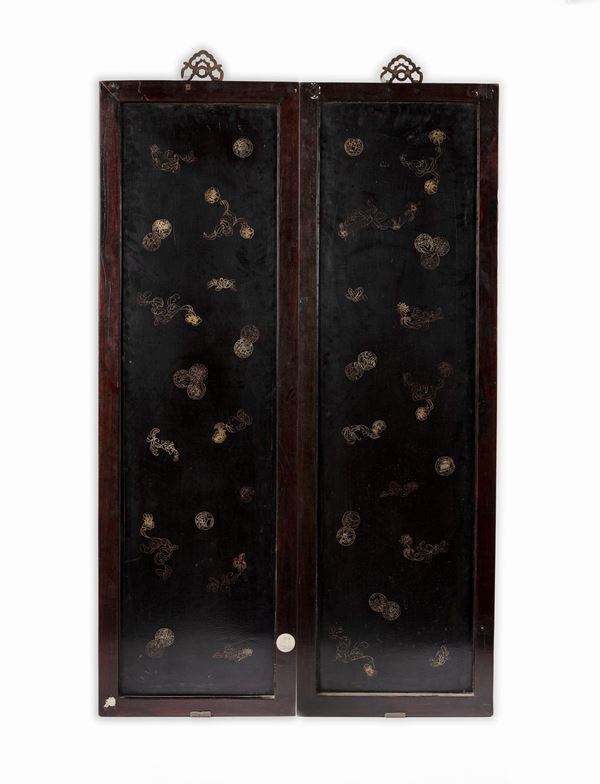 COPPIA DI PANNELLI IN LEGNO LACCATO E GIADA, Cina, inizio XX secolo