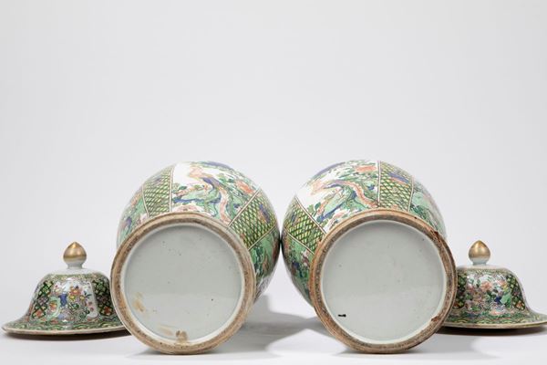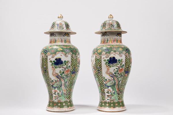 COPPIA DI VASI IN PORCELLANA FAMIGLIA VERDE CON COPERCHIO, Probabilmente Samson, XVIII / XIX secolo
