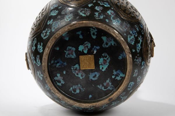 Dalla possente forma con corpo ovoidale allungato e collo corto e svasato con quattro anse a forma di toro con anelli, è ben decorato a rilievo su fondo marrone con motivi arcaistici, taotie e qilong che si intrecciano, è cosparso su tutto il corpo con macchie di colore blu, azzurrino e rosa e finiture in oro; al centro della base è impresso il marchio apocrifo sigillare dorato a sei caratteri dell'Imperatore Qianlong.