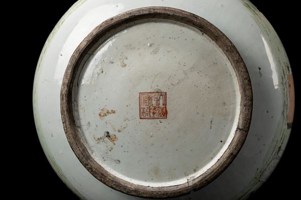 Dalla classica forma, è dipinto su tutto il corpo con una scena continua nei colori della famiglia rosa, con una scena di saggi, dame e bambini in un giardino tra rocce e alberi; al centro della base reca il marchio apocrifo sigillare a sei caratteri in rosso ferro dell'imperatore Qianlong. Poggia sulla sua base in legno.