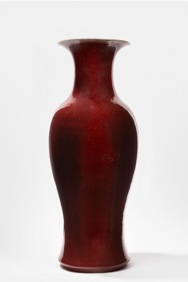 Dalla forma a colonna di balaustra, il vaso è esternamente ricoperto da un bellissimo smalto rosso intenso che sulla bocca sfuma in un color celadon chiaro e che ricopre anche l'interno del vaso. La montatura in bronzo dorato francese del XIX secolo con le anse a forma di dragoni.