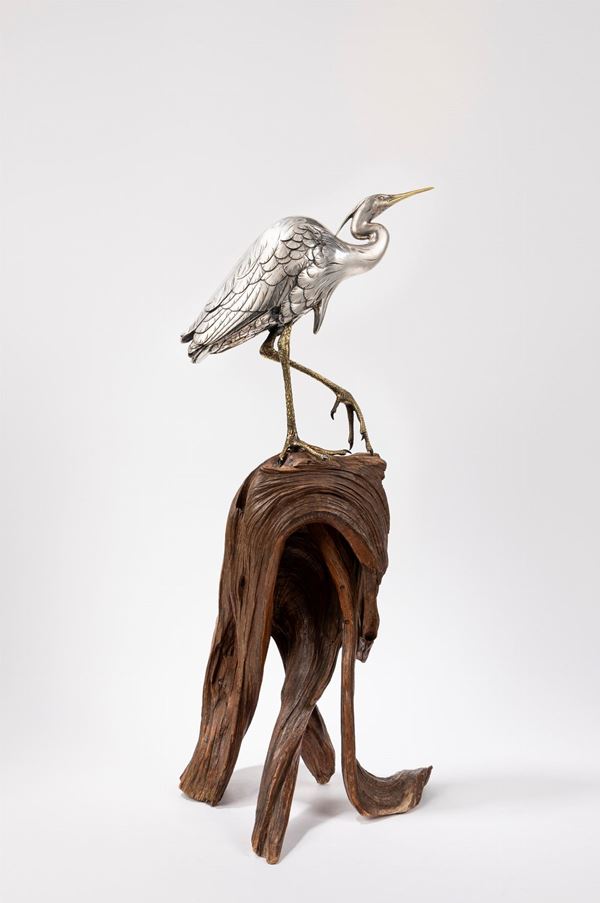 Raffigurante una garzetta con dettagli in shakudo e dorature, poggiante su una base in legno