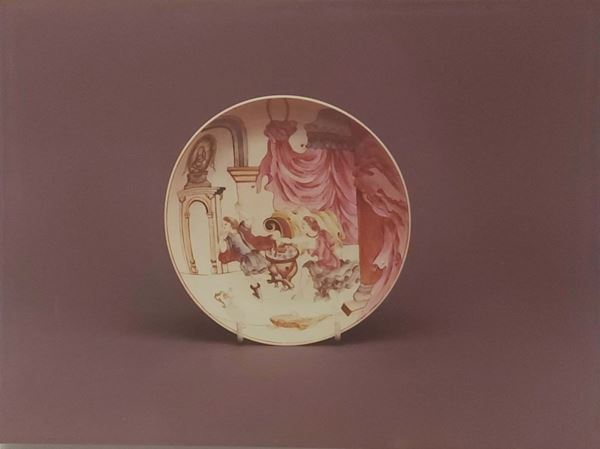 RARO PIATTO IN PORCELLANA FAMIGLIA ROSA CON SOGGETTI EUROPEI, Cina, dinastia Qing, 1750 ca.