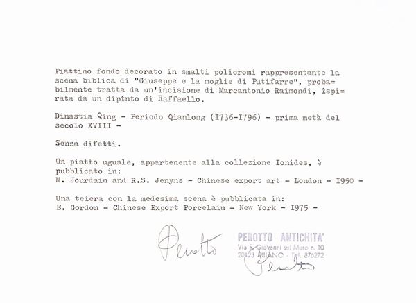 Si veda anche il piatto dall'identica decorazione e della stessa misura presente nella collezione del Musée de la Compagnie des Indes a Citadelle de Port-Louis, oggetto numero M0224000075 (si veda: La porcelaine des Compagnies des Indes à décor occidental, François et Nicole Hervouët, Yves Bruneau, Parigi, Flammarion, 1986, cat. 11.4. Si veda anche: Chinese Export Art in the Eighteenth Century, Margaret Jourdain, R. Soame Jenyns, Londra, Contry Life Limited, 1950, n°91. Si veda anche: Iconographie de l'Art Chrétien, Louis Réau, Parigi, Presses Universitaires de France, 1956, t.II Iconographie de la Bible, I Ancien Testament, p.163-165.).