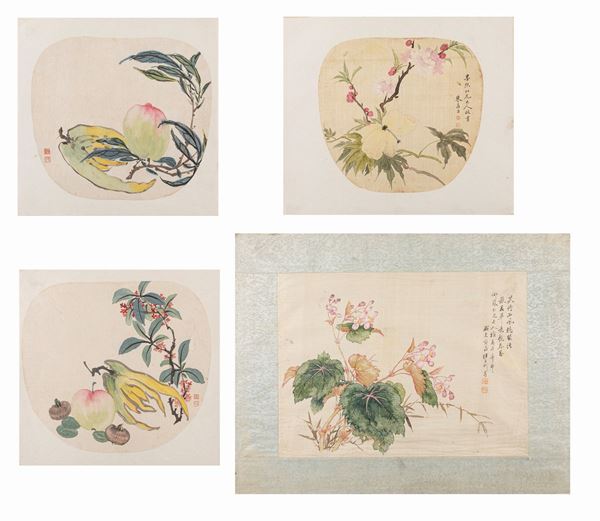 I primi raffiguranti uccellini con iscrizioni e paesaggi floreali; i due su carta con frutti.
