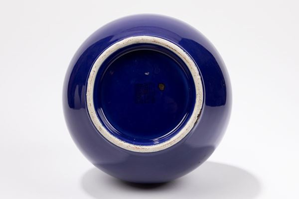 Completamente ricoperto da uno smalto blu intenso, al centro della base reca il marchio apocrifico sigillare a sei caratteri dell'Imperatore Yongzheng.