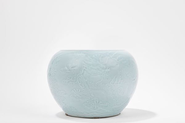 Dalla forma globulare, ricoperto da un bello smalto monocromo e decorato a rilievo con draghi a cinque artigli tra nuvole che inseguono la perla; reca il marchio sigillare a sei caratteri in blu sotto coperta dell'Imperatore Qianlong.