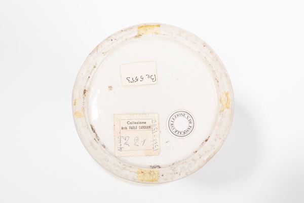 Dalla classica forma gu è completamente ricoperto da uno smalto color avorio; sulla base sono apposte tre etichette, una della collezione V. De Pasquale e una della Collezione Arch. Paolo Candini.