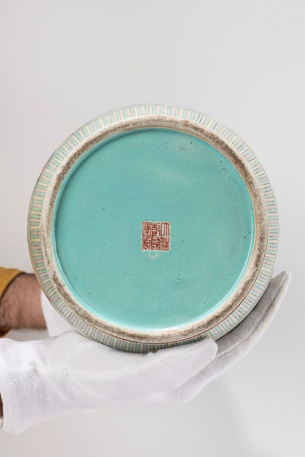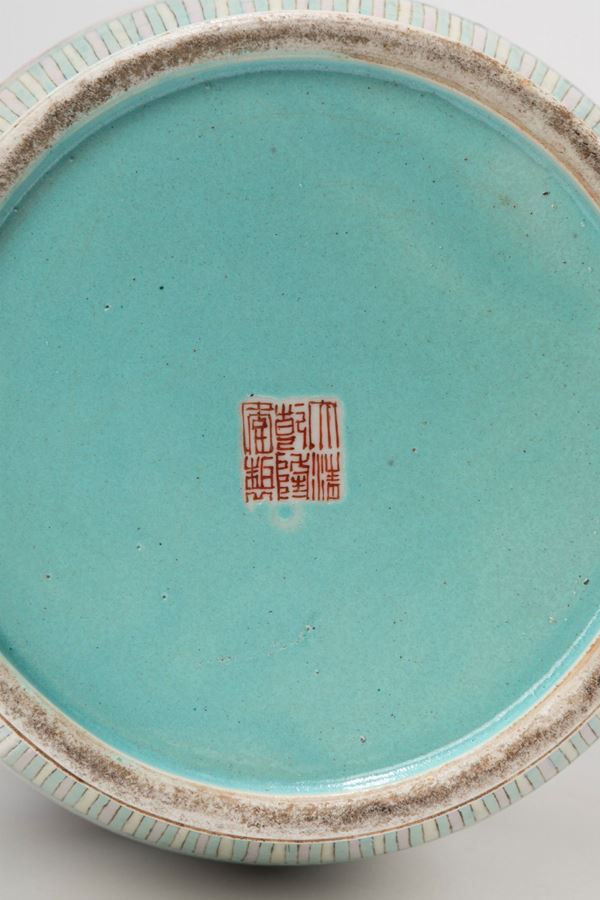 Di forma rouleau, è finemente dipinto sul corpo senza soluzione di continuità con una scena di palazzo raffigurante dignitari in processione che portano doni; il collo delimitato da una fascia a motivi floreali, è decorato con un paesaggio montuoso tra le nuvole; al centro della base smaltata in turchese, reca il marchio apocrifio sigillare a sei caratteri in rosso ferro dell'imperatore Qianlong.