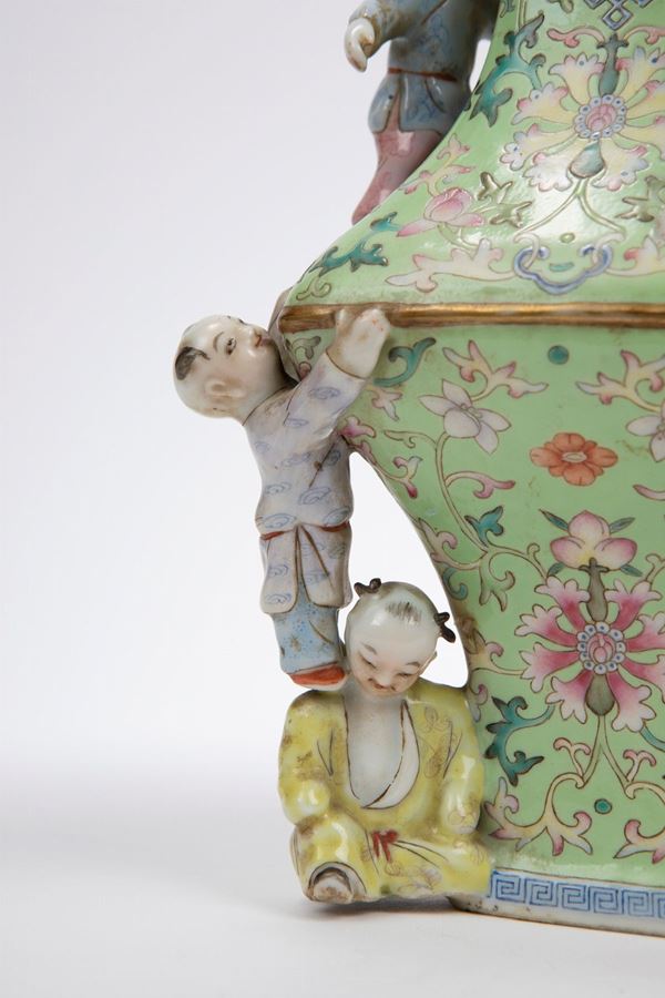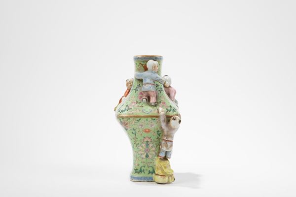 Dalla forma a colonna di balaustro quadrata, è dipinto con scroll di fiori e foglie su fondo verde lime; sul corpo si arrampicano cinque bambini che giocano; al centro della base turchese reca il marchio apocrifo sigillare a sei caratteri in blu sotto coperta dell'Imperatore Qianlong.