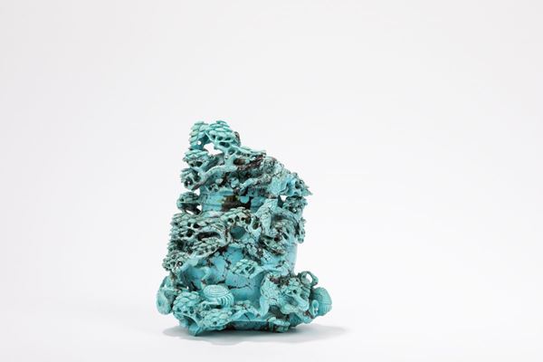 Ben intagliato a forma di vaso con intorno alberi, cicogne e lingzhi.