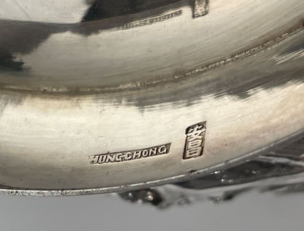 Di forma circolare sbalzata con decorazione raffigurante fiori e foglie di loto, parte interna liscia, punzonata "HUNG CHONG"; Peso g 683.