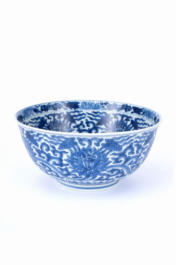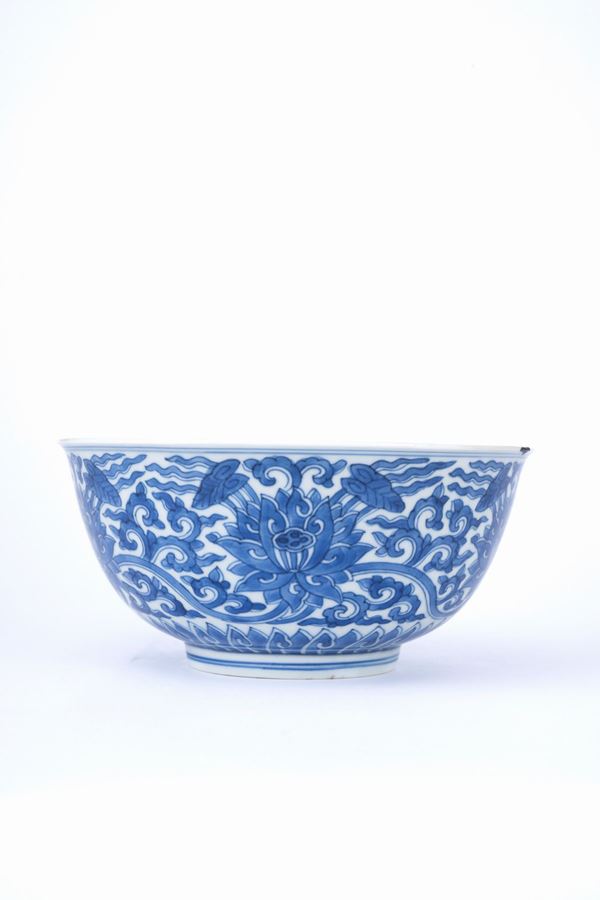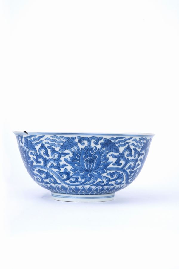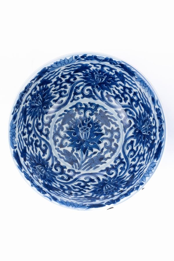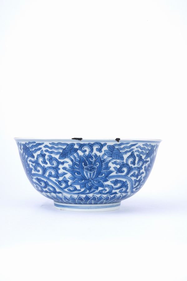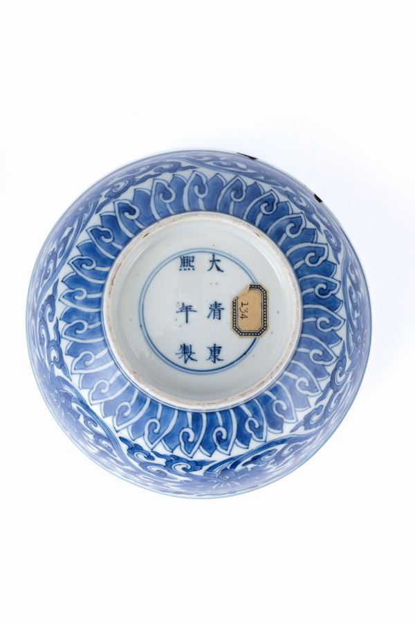 Ben dipinta con un intenso blu sotto coperta all'interno e all'esterno con lotus scroll, al centro della base presenta il marchio a sei caratteri in blu sotto coperta dell'Imperatore Kangxi all'interno di un doppio cerchio.