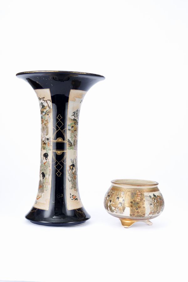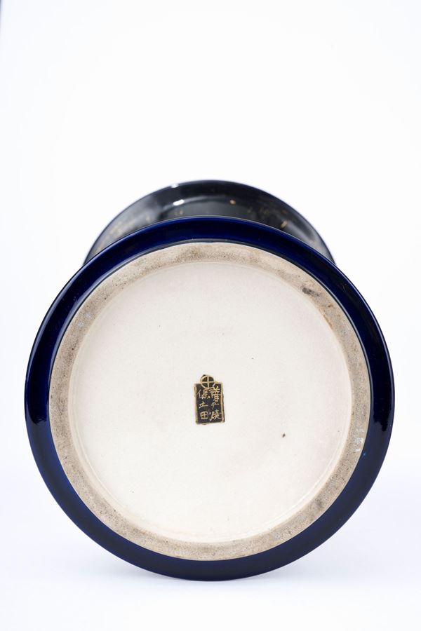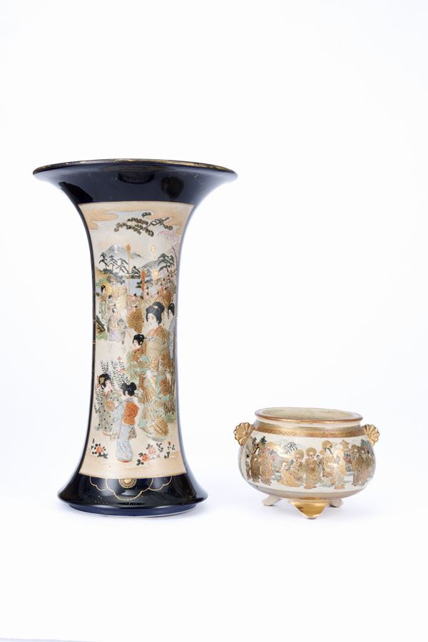 Un vaso a forma di tromba decorato entro doppia riserva su fondo blu raffigurante scene di vita quotidiana all’aperto e un vaso di forma circolare raffigurante saggi e geishe; firmati.
