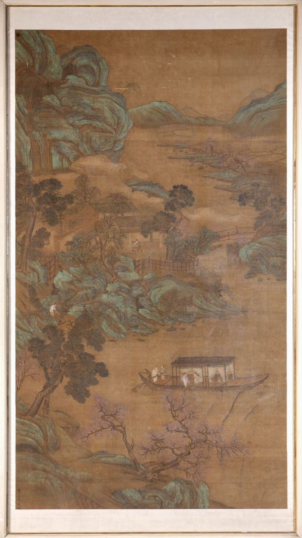 Raffiguranti rispettivamente dei personaggi su un'imbarcazione su un fiume tra montagne e alberi e un paesaggio montuoso con al centro una pagoda e in alto a sinistra iscrizioni.
