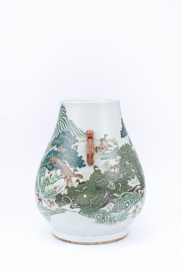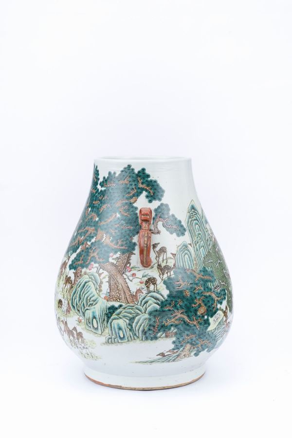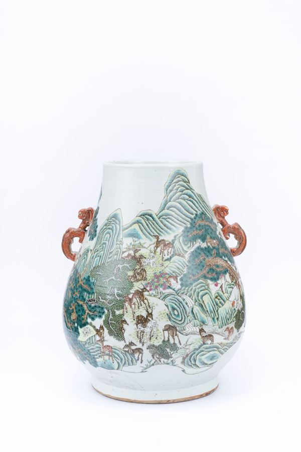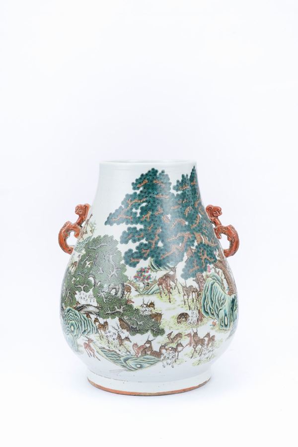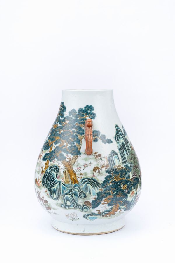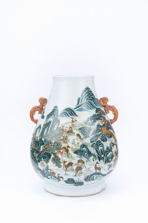 Entrambi dalla classica forma Hu che si solleva da un piede dritto, sui fianchi della parte superiore affusolata del corpo piriforme sono applicate una coppia di anse a forma di draghi stilizzati; sono vivacemente dipinti con un branco di cervi maculati smaltati in bianco, beige e marrone, variamente raffigurati al pascolo e al galoppo in un campo aperto tra pini, rocce scoscese e lingzhi, accanto a un ruscello serpeggiante che scorre dalle montagne facendo da sfondo alla scena; al centro della base recano il marchio apocrifo sigillare a sei caratteri in blu sotto coperta dell'Imperatore Qianlong.