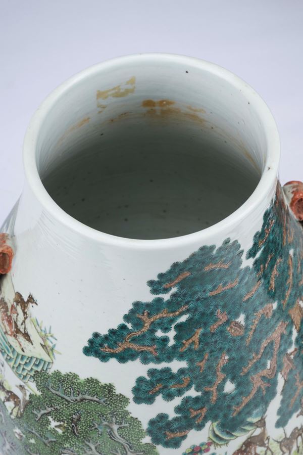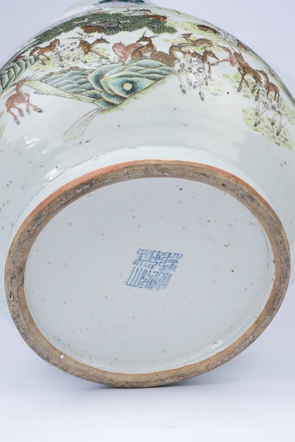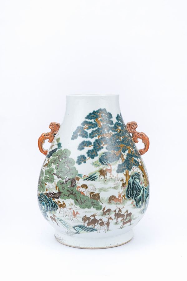 DUE VASI IN PORCELLANA FAMIGLIA ROSA A MOTIVO "CENTO CERVI", Cina, fine XIX secolo / inizio XX secolo