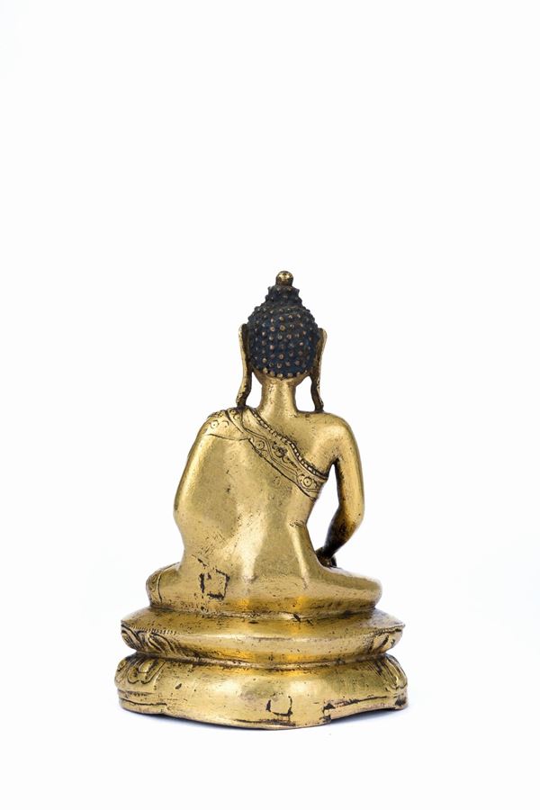 FIGURA DI SHAKYAMUNI IN BRONZO DORATO, Tibet - Nepal, XVIII / XIX secolo