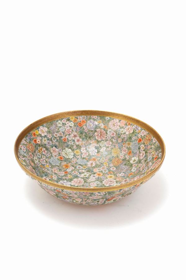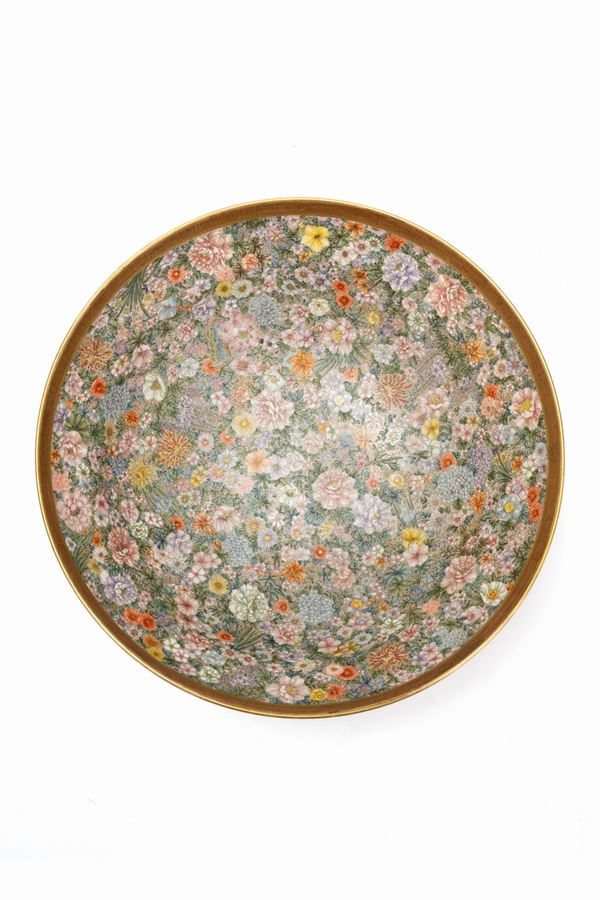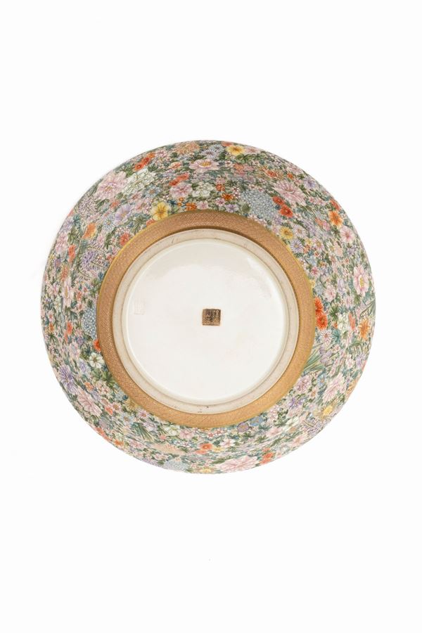 Con decoro millefiori in smalti policromi ed oro zecchino ad esaltare ogni singolo fiore; decoro pieno a tutto tondo sul lato esterno ed interno; firmata Kinkozan.