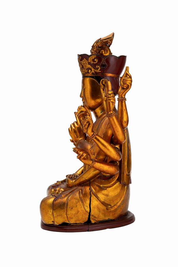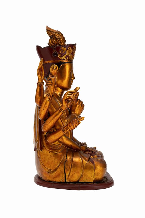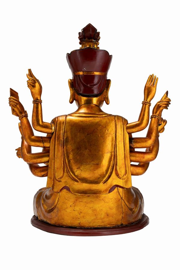 Raffigurata con un un bel viso rotondo con l'espressione dolce e serena e gli occhi chiusi assorti in meditazione, lunghi lobi e una sontuosa tiara; ha dodici braccia: due nel gesto della preghiera, due posate sul grembo e le altre che reggono i vari attributi rituali.