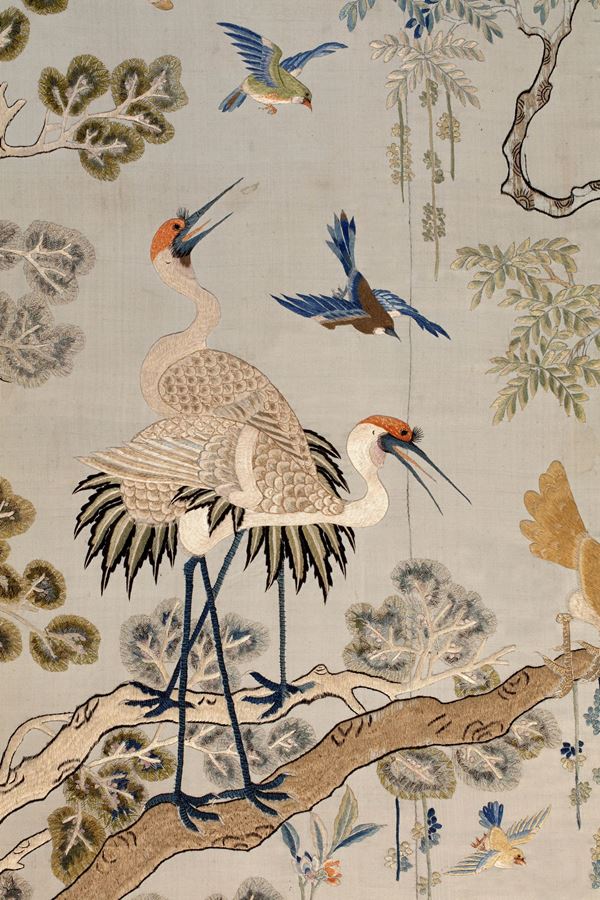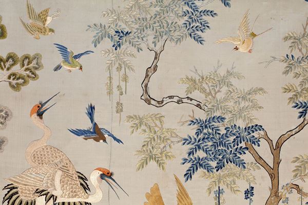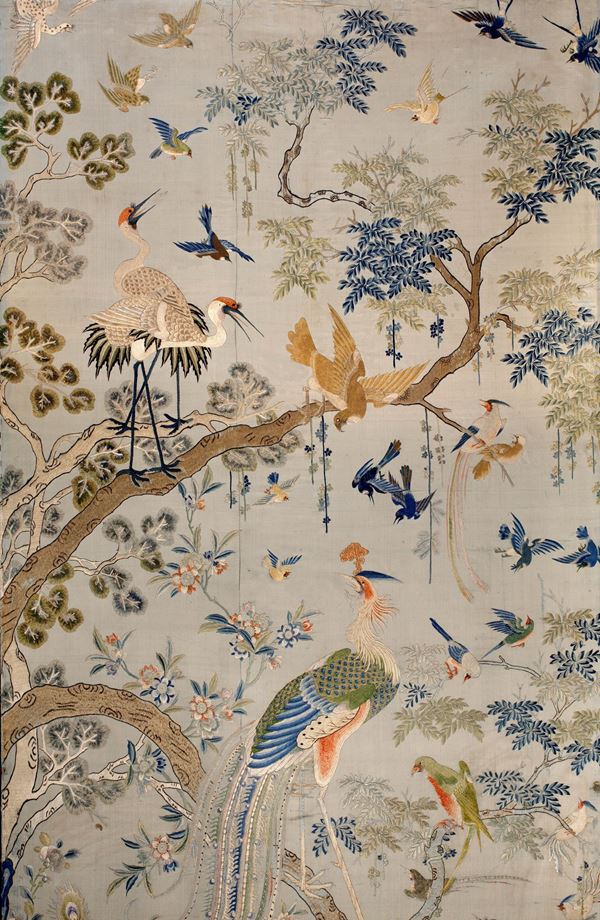 Ricamo su raso di seta di grandi dimensioni, è finemente ricamato in seta e filato metallico (oro cartaceo) a punto raso, punto pieno e punto posato. Il soggetto rientra nella classica categoria “fiori e uccelli” (huaniao), dove tuttavia la protagonista della scena, anche per le dimensioni con cui è rappresentata è una fenice (fenghuang). Appollaiata su di un grosso ramo ricurvo che occupa centralmente la scena, nella simbologia cinese il volatile allude all’imperatrice.