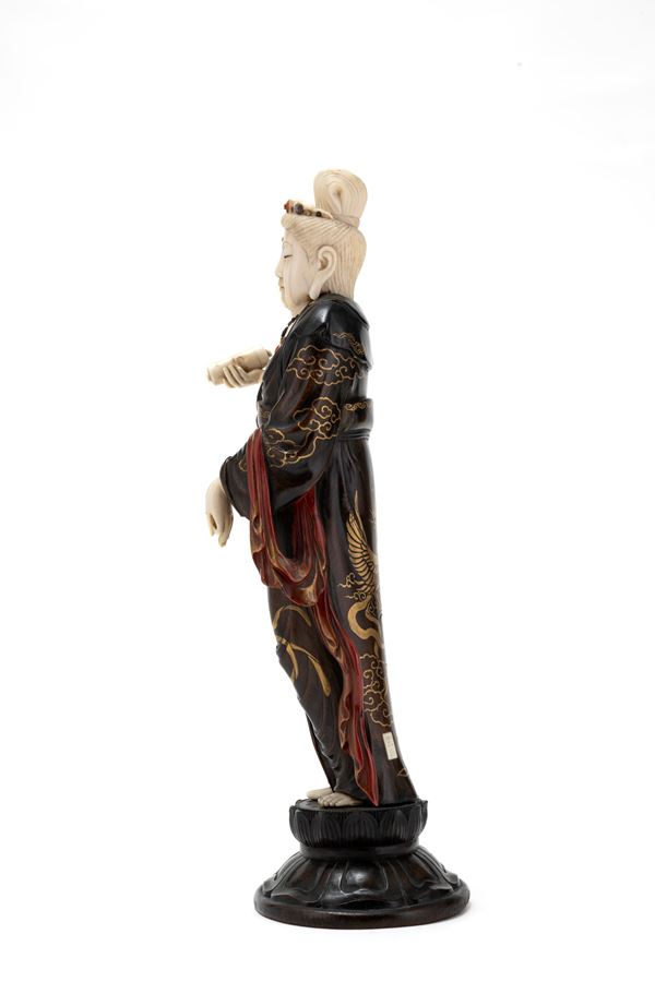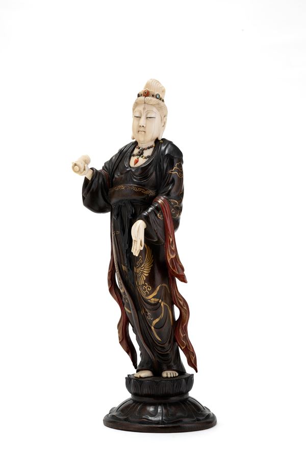 Con intarsi Shibayama raffigurante la Dea Kannon in posizione eretta sopra una base in legno a forma di fiore di loto. Tiene una pergamena nella mano destra; firma sul retro entro tassello in madreperla.