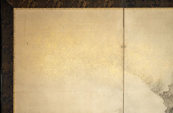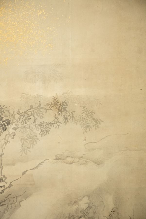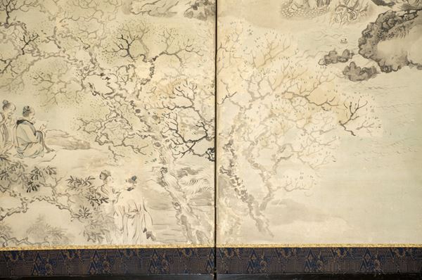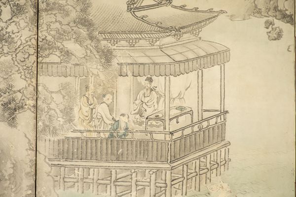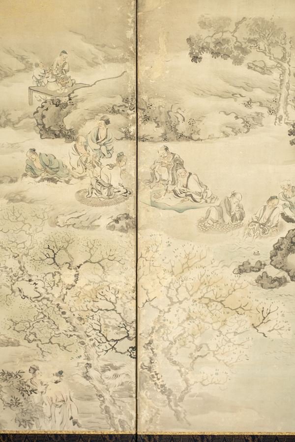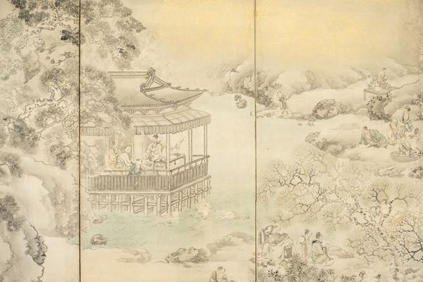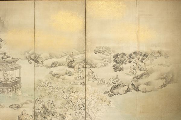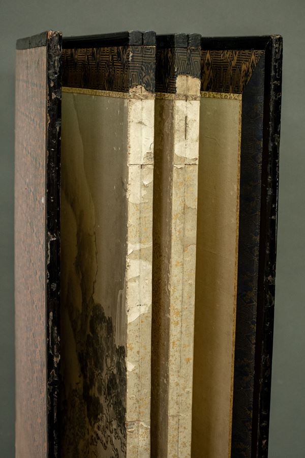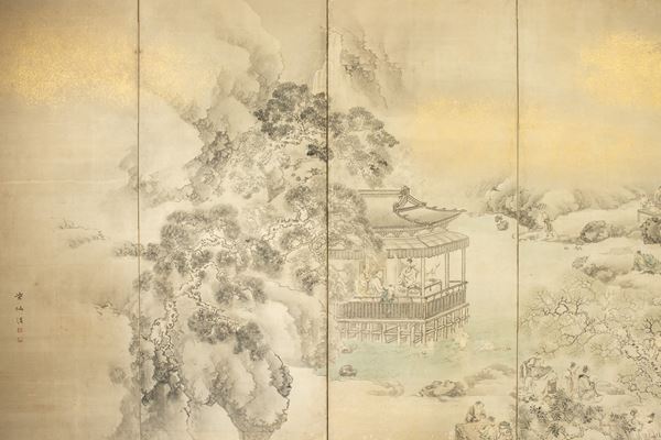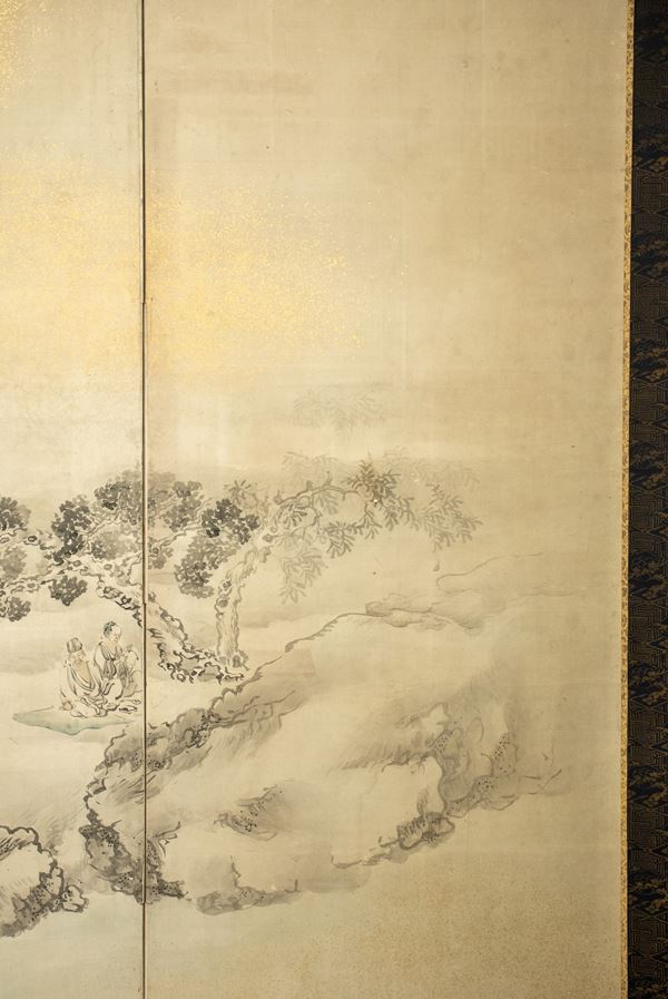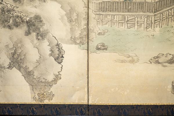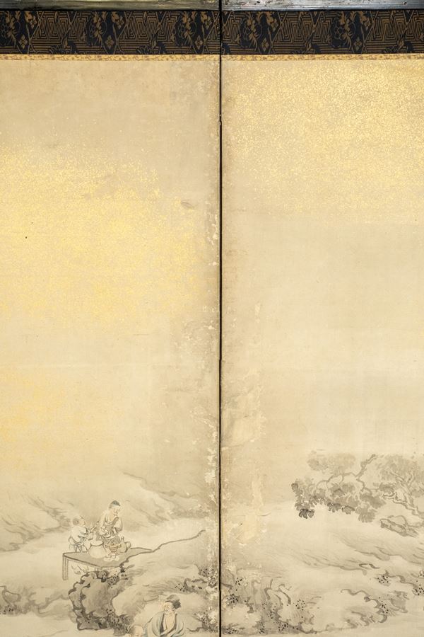 Pieghevole a sei pannelli dipinti su carta su fondo chiaro in un suggestivo monocromo nero e polvere d’oro, raffigurante una casa tradizionale giapponese e personaggi ai bordi di un fiume circondato da colline. Firmato.