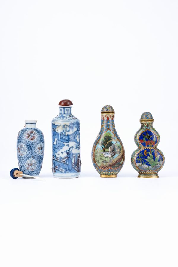 Due in porcellana dipinte in blu e rosso sotto coperta, la più alta raffigurante personaggi in un paesaggio e recante marchio apocrifo a sei caratteri Yongzheng, l'altra decorata con lotus scroll; le altre due in cloisonnè decorate con fiori e uccelli.