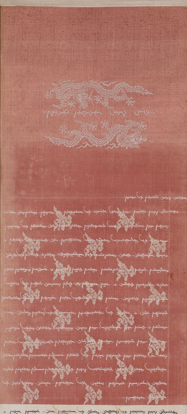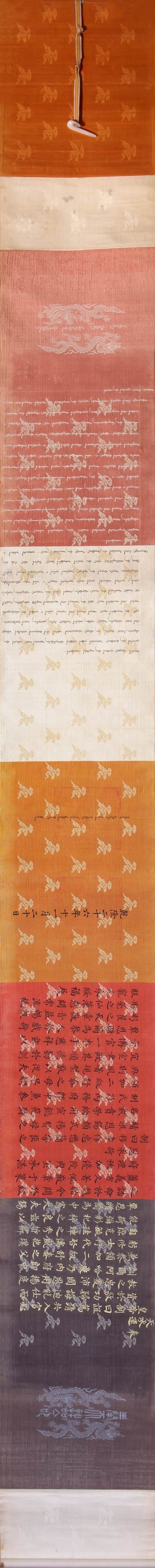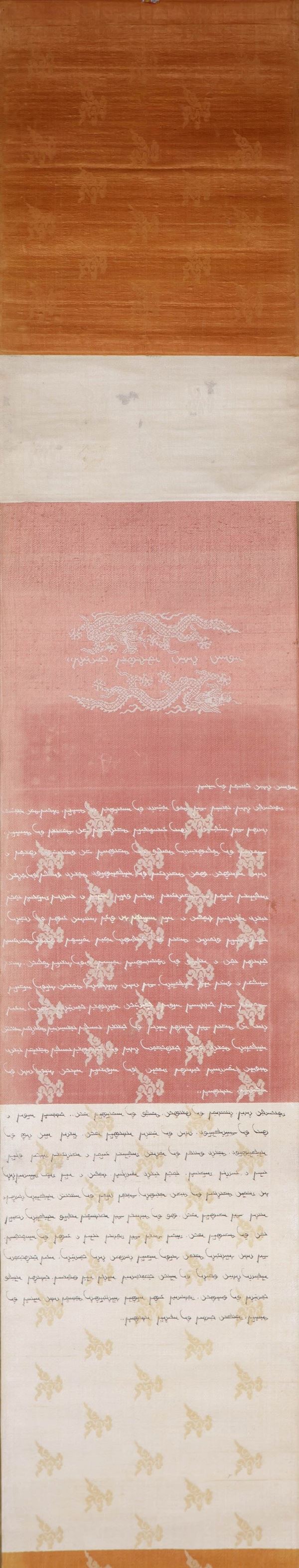 Scritto su diversi tessuti di broccato di seta di differente colore con un denso motivo di nuvole all'interno e sull'esterno lotus scroll, è realizzato come un rotolo leggibile da sinistra a destra in manciù, e ripetuto da destra a sinistra in caratteri cinesi, recante iscrizioni corrispondenti al 26° anno del regno di Qianlong (1761); la sezione di apertura è decorata con due dragoni che affiancano i caratteri fengtian gaoming ('mandato imperiale del cielo') come simbolo di autenticità; la chiusura è realizzata in giada bianca di Hetian.