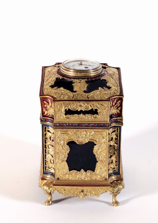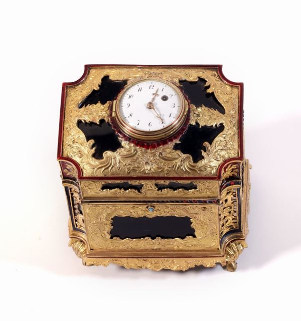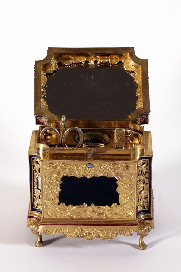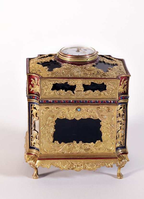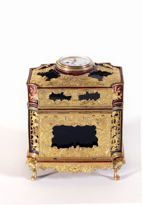 Di forma rettangolare con angoli stondati, è sorretto da quattro piedini a guisa di zampa di aquila con artigli che afferrano una sfera. La scatola finemente cesellata e sbalzata a volute e motivi fogliacei presenta degli inequivocabili richiami al gusto orientale, come i quattro fiori di loto che fuoriescono dallo smalto a fuoco rosso steso nei quattro angoli del coperchio. Lo stesso fiore è poi ripreso, in ogni riserva di cui è composta lo scrigno, all’interno delle quali si trovano delle sottilissime lastre in vetro color zaffiro. La cordonatura del coperchio è stata realizzata con zaffiri e rubini incastonati in alternanza che arricchiscono ed impreziosiscono l’oggetto e si combinano armoniosamente agli smalti, blu e rosso, presenti sul corpo della scatola e sul coperchio. L’orologio fuoriesce dal coperchio e anch’esso è contornato da smalti rossi. All'interno sono presenti necessaire.