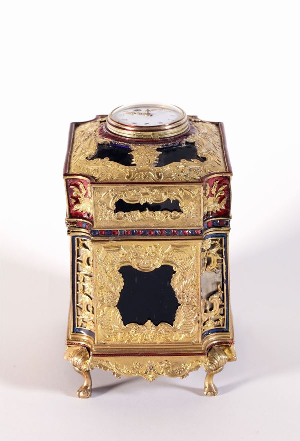 RARO SCRIGNO MONTATO CON OROLOGIO IN METALLO DORATO E VETRO, Cina, dinastia Qing, XVIII secolo