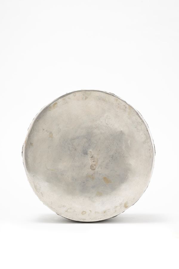 Decorata a sbalzo con dieci pannelli e sul coperchio un medaglione centrale raffiguranti animali, fiori e piante. Peso g 878.