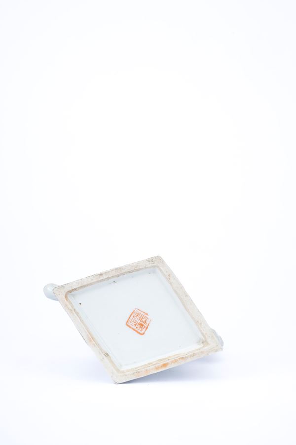 Di sezione romboidale, è dipinta con personaggi; al centro della base reca il marchio apocrifo sigillare stampato in rosso dell'Imperatore Tongzhi.