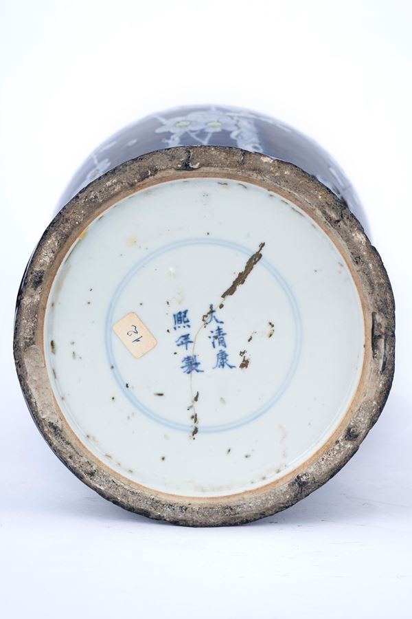 Dalla forma a colonna di balaustra, è dipinto su fondo nero con alberi di pruno; sulla base reca il marchio apocrifo a sei caratteri in blu sotto coperta dell'Imperatore Kangxi all'interno di un doppio cerchio.
