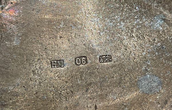 Sul piatto è cesellato con rami di pruno fioriti, al centro è inciso con iniziali; bordo traforato e sbalzato raffigurante draghi tra le nuvole; manici a forma di testa di drago. Peso tot g 2560.