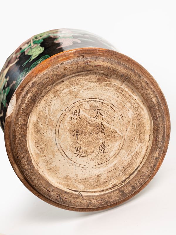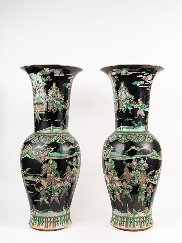 Raffiguranti la scena del "Romanzo dei Tre Regni", figure con espressioni vivide, finemente dipinte in smalti colorati su uno sfondo nero e suggestivo. Completi di due basi in legno, sulla base reca il marchio apocrifo inciso a sei caratteri dell'Imperatore Kangxi.