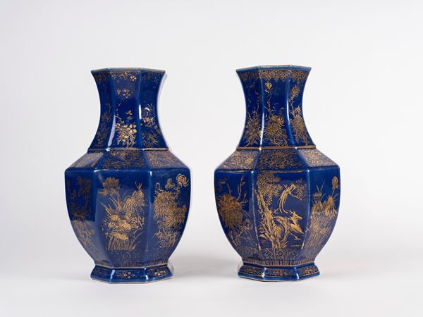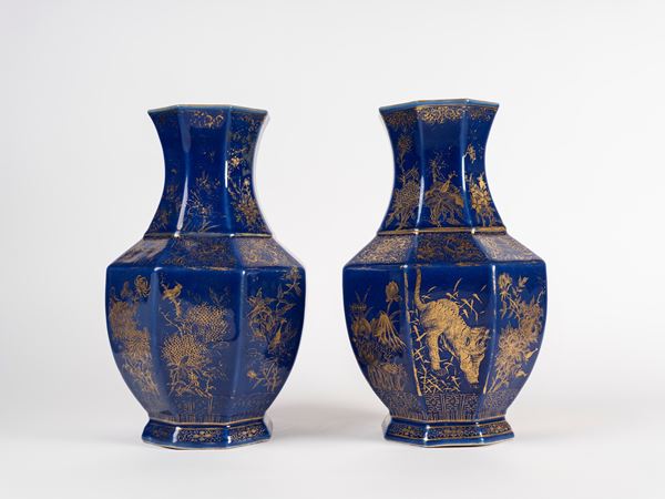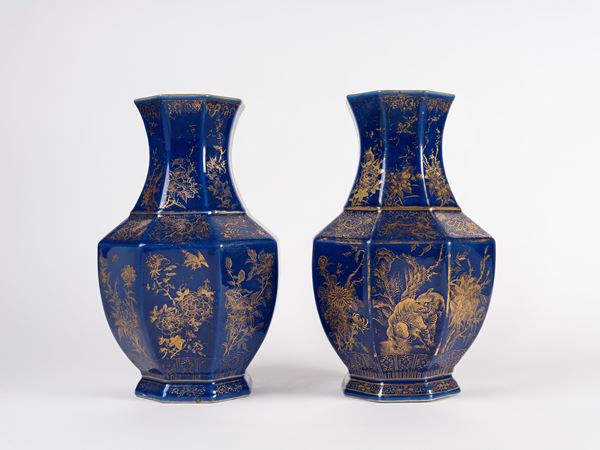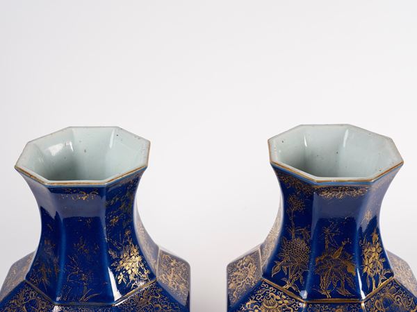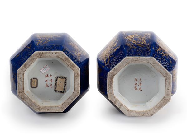 COPPIA DI VASI IN PORCELLANA A FONDO BLU E ORO, Cina, marchio e periodo Guangxu (1875-1908)