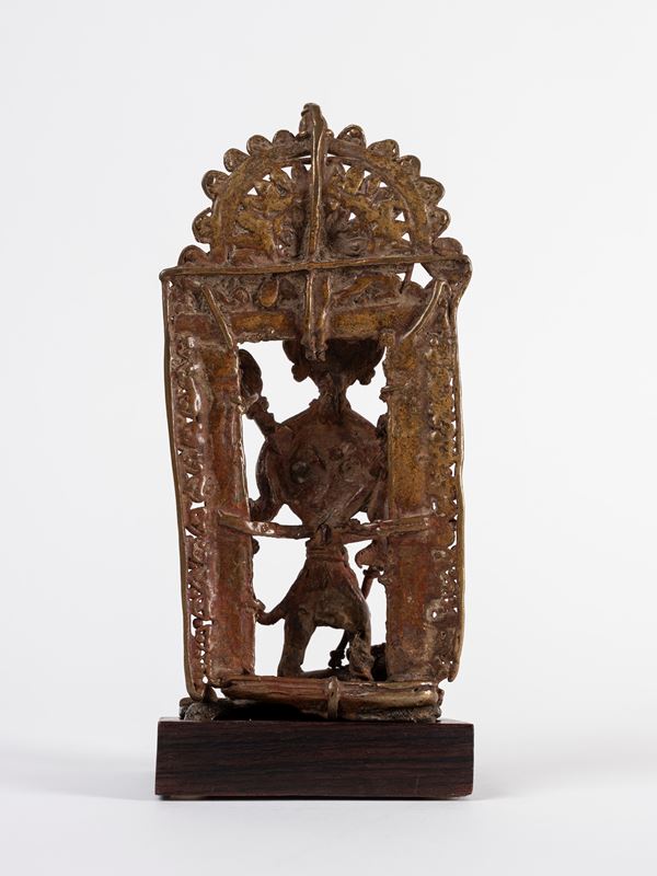 Raffigurante Mahishasuramardini con quattro braccia nell’atto di trafiggere con il tridente il demone Mahisha che cerca di salvarsi trasformandosi in bufalo. La due braccia superiori impugnano una spada e il disco del potere. Quella sinistra inferiore infila il tridente nel bufalo e quella destra estrae il corpo del demone in forma umana.