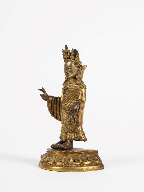 Raffigurante Udayana Buddha in posizione eretta su una base a fiore di loto con petali cesellati, con la mano destra sollevata in abhaya mudra e la mano sinistra in varada mudra, indossa una larga veste drappeggiata e cesellata con fiori. Sul capo porta un diadema, porta orecchini.