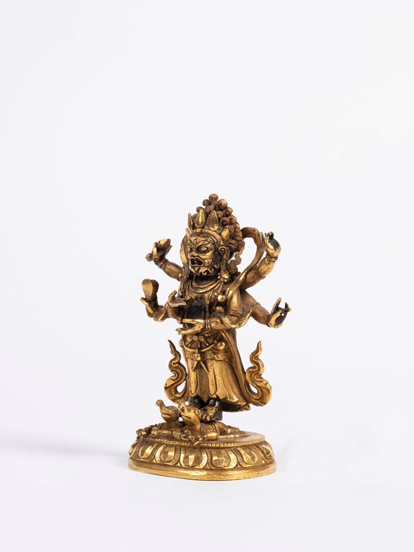 Raffigurante Mahakala Shadbhuja con sei braccia, stante su una base a fiore di loto calpestando due Vignataka con teste di elefanti.
