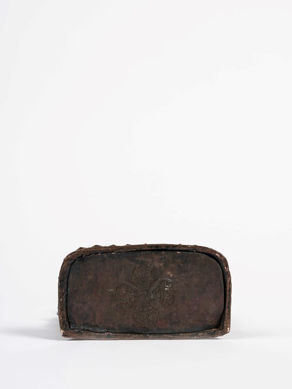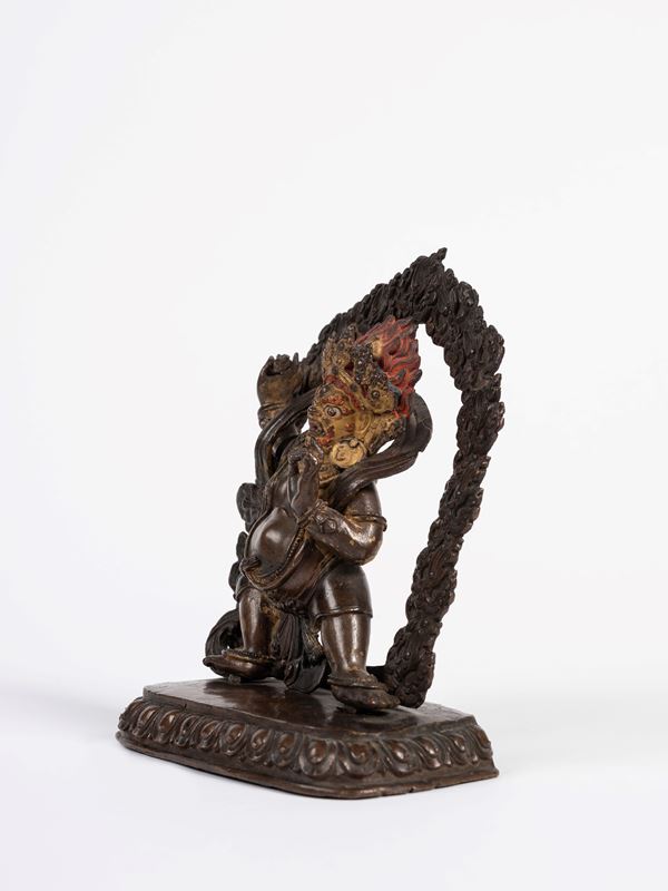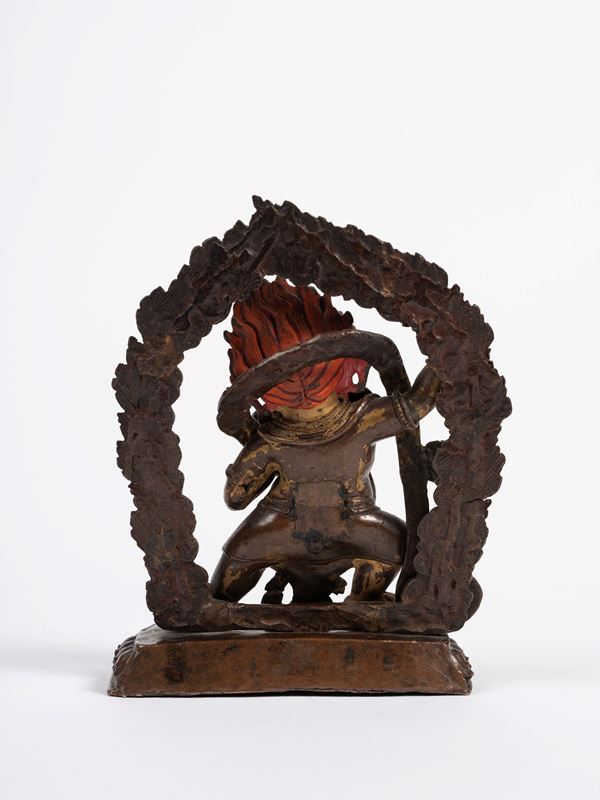 Raffigurante Vajrapani, finemente fuso in alidhasana, con la mano destra che regge un vajra e la sinistra in katakamudra; adornato di serpenti, gioielli e nastri svolazzanti. Il volto feroce con occhi sporgenti e capelli a forma di fiamma sopra una corona. Poggia su una base a fiore di loto e sul retro presenta una fiamma, tracce di doratura.