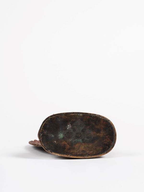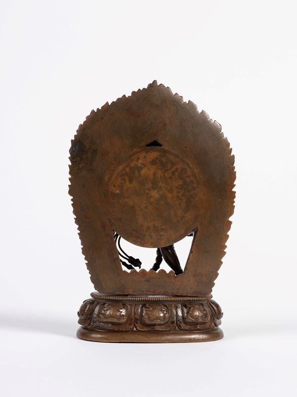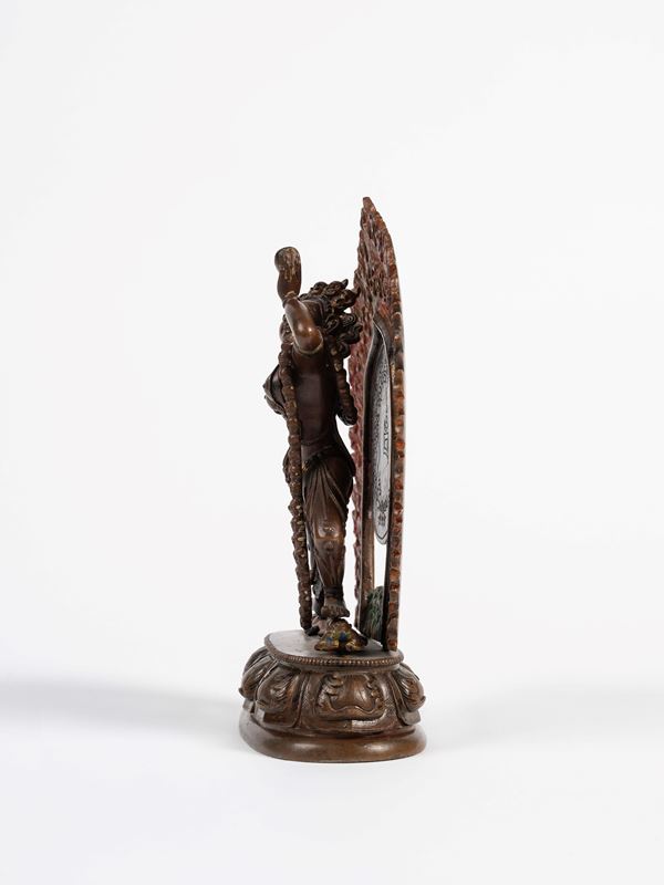Raffigurante Vajrayogini che nella mano destra tiene un kartika e con la mano sinistra beve del sangue da un kapala, col piede destro calpesta il petto di Kalaratri e col piede sinistro la fronte di Bhairava. Il corpo seminudo è adornato da gioielli e porta una collana con cinquanta teschi e sul capo una corona con cinque teschi. La figura poggia sopra una base a fiore di loto da cui sorge una fiamma che reca al centro un medaglione con caratteri in sanscrito. Presenta tracce di doratura e smalti policromi.