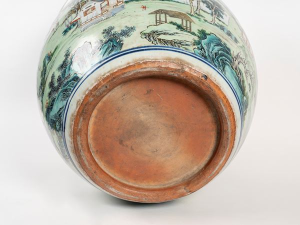 Ben decorata su tutto il corpo senza soluzione di continuità con smalti brillanti, raffigura un paesaggio montuoso edifici tra alberi e nuvole, mentre dei personaggi popolano la scena. Sotto al bordo presenta una greca.