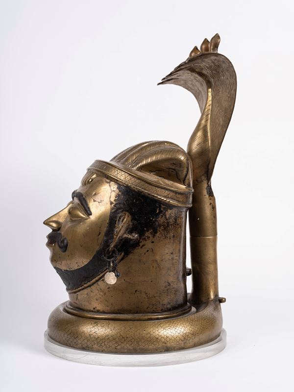 Ben modellato, raffinato nei particolari indossa due orecchini, con grandi occhi dallo sguardo intenso, dietro alla testa sorge un cobra.